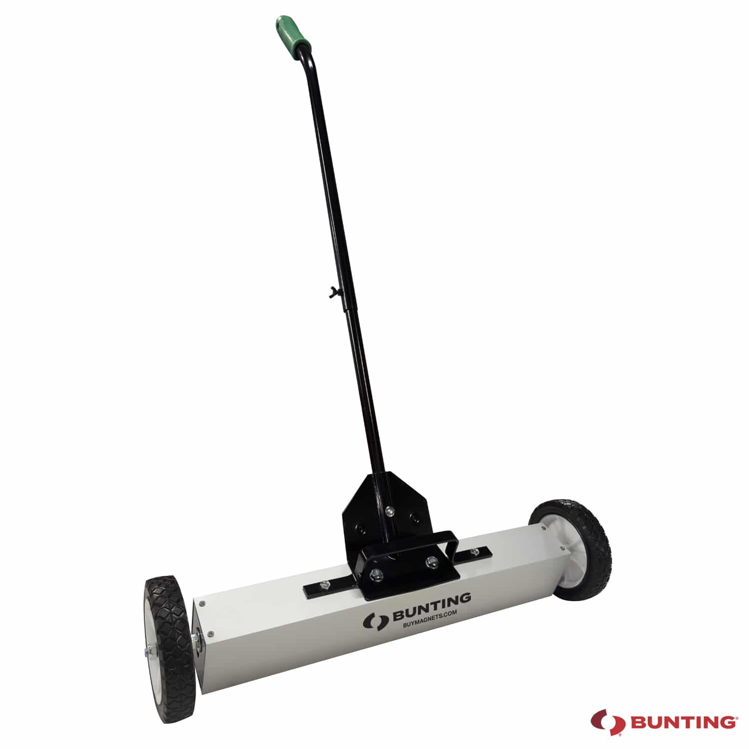 Bunting’s magnetic push sweepers are a lightweight yet heavy-duty, labor-saving solution to the problem of keeping shop floors, parking lots, sidewalks, carpet, grass, and construction sites free of damaging ferrous debris. The powerful, high reach-out, magnetic lifters ride on 7″ diameter plastic wheels with rubber treads for easy going when traveling on rough surfaces. Magnetic sweepers offer balanced weight for comfortable operation and a removable 41″ handle for space-saving storage. No operating costs, and once the floor is swept, quickly clear debris from the magnetic sweeper with the one-pull release. Lifts ups nails, nuts, screws, tacks and other metal objects from up to 2″ away. Magnetic sweepers are available in 14.5″, 24″ and 36″ widths.